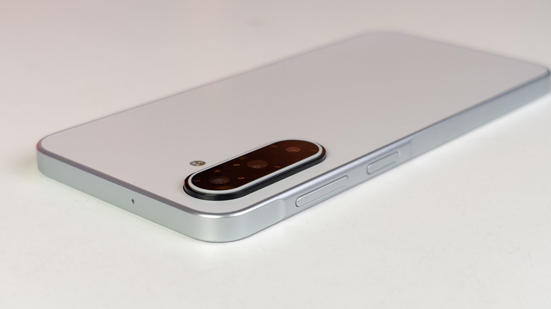 My Moonlight Silver unit has a subtle, matte plastic back panel. This finish is a practical choice as it resists fingerprints effectively, keeping the phone looking clean. The rear camera module is a simple vertical pill shape on the top left, giving it a familiar, minimalist Samsung look. The overall construction uses a plastic frame and back, but the fit and finish are tight, giving it a decent sense of sturdiness.